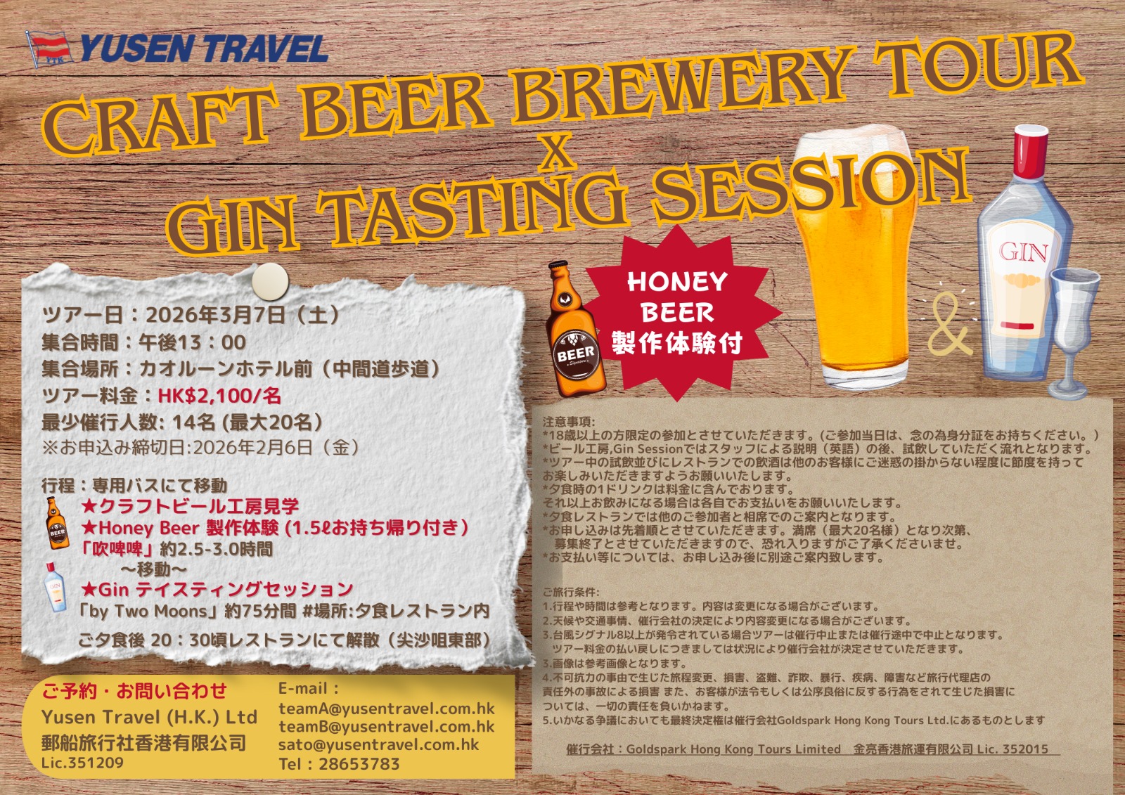ビール工房での試飲+ビール製造体験、及び香港クラフトジンのTasting Session(レストラン内で開催)を計画しております。
